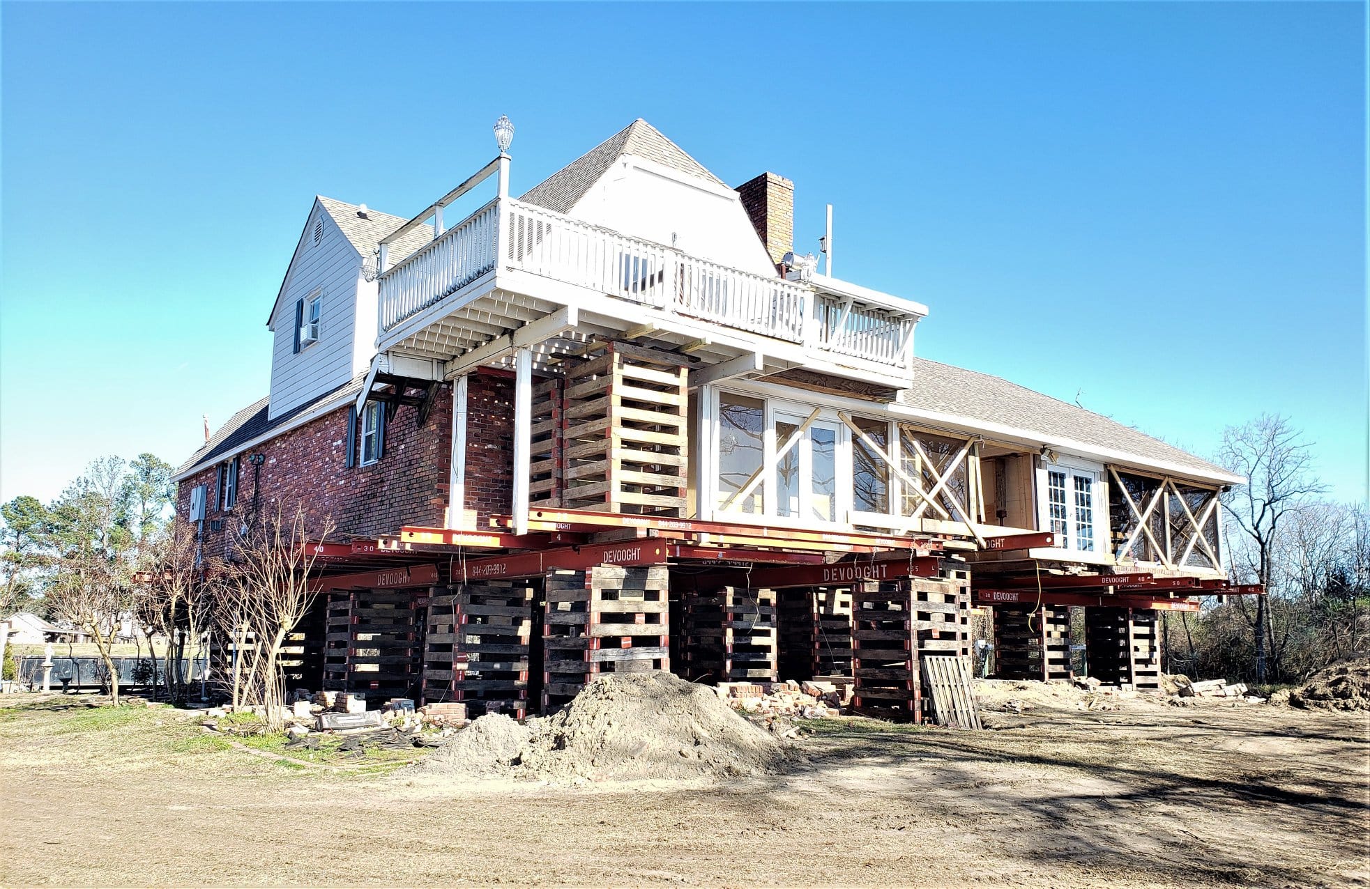 We lifted the house 8 feet using our 24-jack hydraulic lift system. In addition to lifting the middle section of the house off the slab foundation, we lifted the structure with the exterior brick, 2 large brick chimneys, and Billiards room featuring 3 walls of windows.