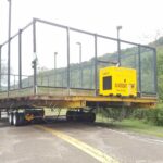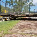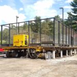 Once lifted, two Holland Dollies and two Buckingham Power Dollies (32 tires in all) were placed under the main beams. A Buckingham BU-173 remote control unit was used to power the wheel system. The structure was moved to the new recreation area, lined-up over one of the four brand-new, pre-built pier foundations that had been installed around a common new-construction service building. After the structure was set down, we brought the equipment back to the original site and repeated the process for each of the remaining three structures.